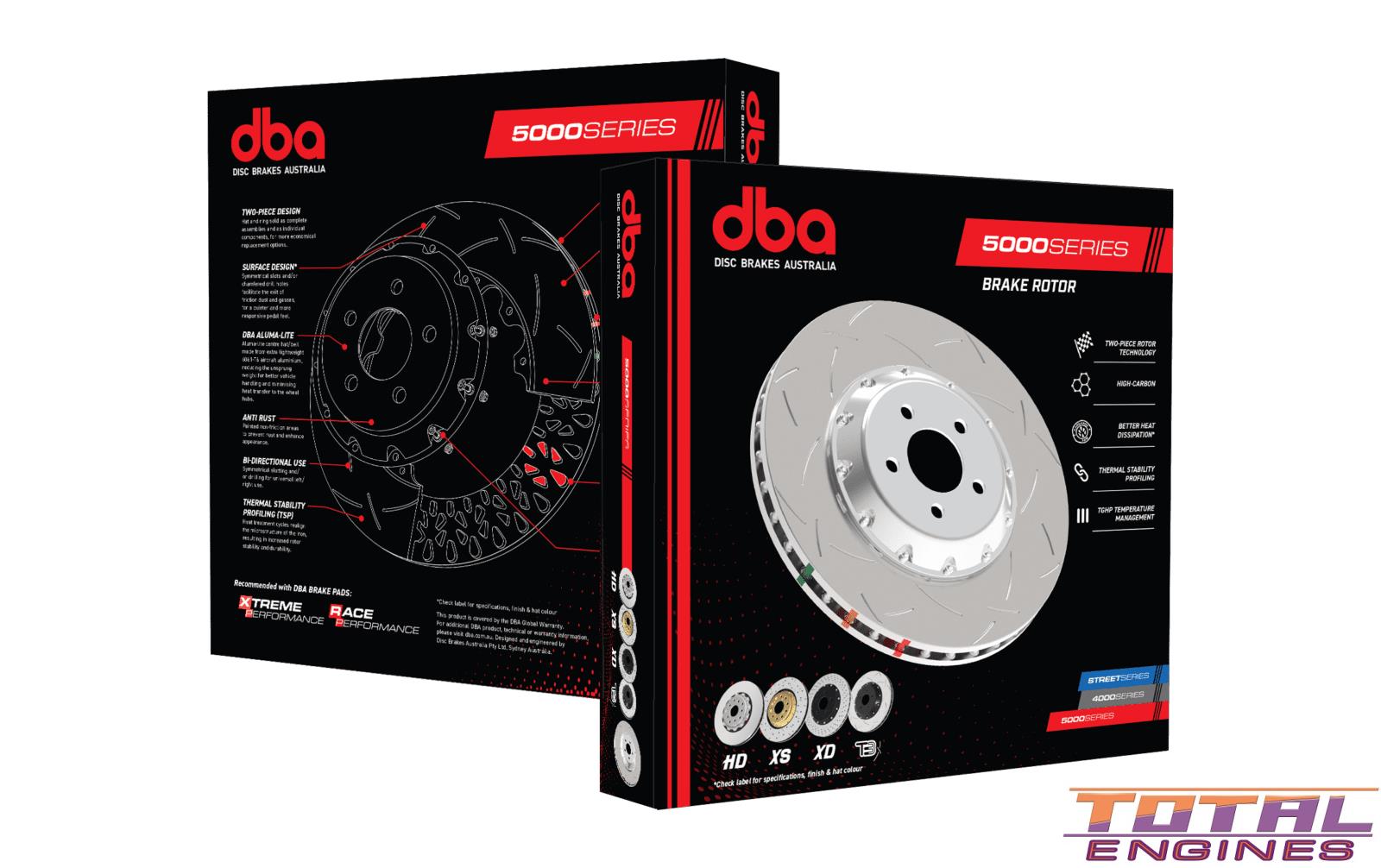 1. Two Piece DesignHat and rings sold as complete assemblies and as individual components, for more economical replacement options. 2. Surface Design Symmetrical slots facilitate the exit of friction dust and gasses, for a quieter and more responsive pedal feel. * 3. DBA Aluma-Lite Aluma-lite centre hat / bell made from extra lightweight 6061 T6 aircraft aluminium, reducing the unsprung weight for better vehicle handling and minimising heat transfer to the wheel hubs. 4. Anti Rust Painted non-friction areas to prevent rust and enhance appearance. 5. Bi-Directional Use Symmetrical slotting and/or drilling for universal left/right use. 6. Thermal Stability Profiling (TSP) Heat treatment cycles realign the microstructure of the iron, resulting in increased rotor stability and durability. Centre split core castings for increased heat transfer and thermal efficiency. 7. Thermal Efficiency Centre-split core castings for increased heat dissipation and thermal efficiency.* 8. CBN Cubic Boron Nitride machine turned finish, minimising disc thickness variation and the potential for pad “knock” and resulting premature wear. 9. Thermographic Heat Paint (TGHP) Paint markings change colour at specific temperature thresholds to assist with the monitoring of braking temperatures and rotor fatigue. 10. High Carbon Alloyed Iron Formulation allows for optimal interaction with DBA’s thermal stability profiling. Increases the capacity of the rotor to handle constant and extreme heat over prolonged periods. 11. Kangaroo Paw Unique Kangaroo Paw vein design for up to 20% better heat dissipation, increasing braking effectiveness and prolonging brake life.* 12. NAS Bolts & Nuts National Aerospace Standards (NAS) bolts and crimp nuts for maximum strength at minimal weight.